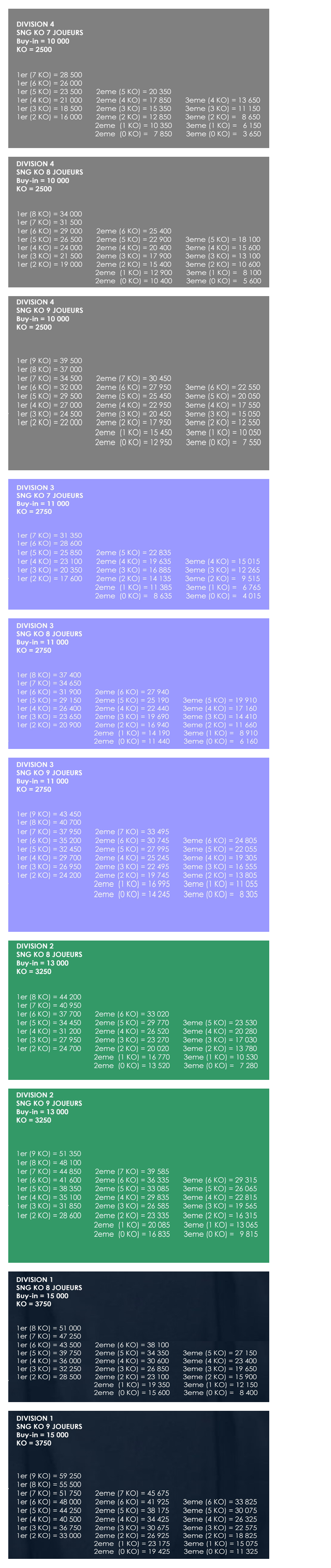 -Le BUY-IN de votre SNG varie en fonction de la division dans laquelle vous jouez :