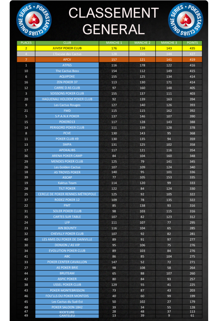 Dans un deuxieme temps, les quatre joueurs selectionnés participeront à 3 manches freeroll (toujours sur PS ONLINE) sous forme de poule.(4 au total) contre les adherents d’autres clubs.