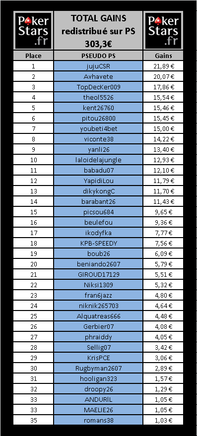 Classement du championnat#25 S.P.A.N.K en ligne avec Pokerstars !